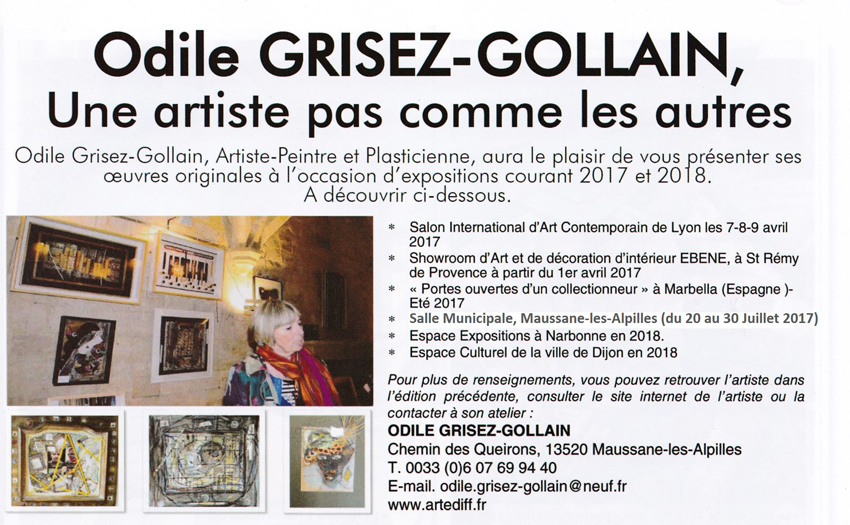 Odile Grisez –Gollain, artiste autodidacte d’origine picarde, vit aujourd’hui dans la Alpilles dans une maison atelier, après avoir fait de longues étapes en activité au Canada, à Paris, au Languedoc. Une Vocation et Formation artistiques de jeunesse pour les arts (Danse, Musique, Théâtre et Arts plastiques) :