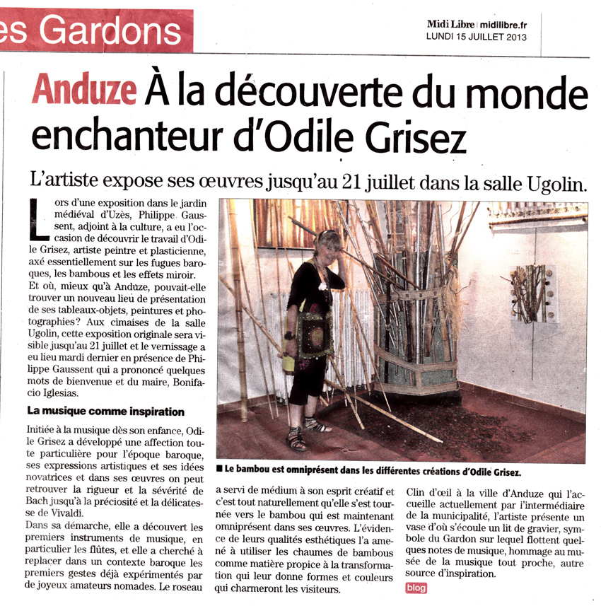 2013 : « Bambous - Effets Miroir- Fugues Baroques- en UZES et ANDUZE » présentaient un concert imaginaire de musique baroque . Ce sont les chefs d’œuvres de Bach, Vivaldi, Haendel …qui ont été a l’origine de ces hommages rendus par les œuvres d’Odile-Grisez-Gollain aux compositeurs et leurs interprètes du passé et d’aujourd’hui. Avec pour ambition de faire résonner par de nouveaux instruments en chaume de bambous, de tableau en tableau, une autre musique . Ces expositions ont aussi proposé au public de revenir aux sources de l’histoire de la musique avec ses musiciens nomades en célébrant flûtes et orgues. (A voir :Film sur site Dailymotion : odile. grisez-gollain-Exposition - Uzes.2013).